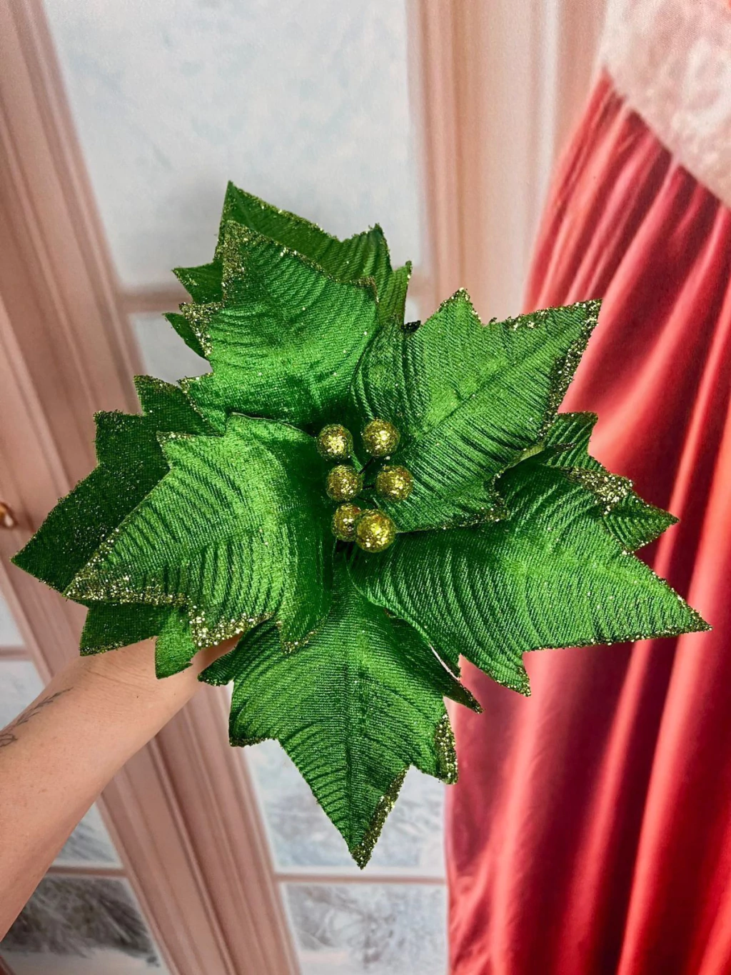 Linda e vibrante, esta flor decorativa na cor verde bandeira traz brilho e elegância com suas pontas realçadas por glitter. Com 26 cm de diâmetro, é perfeita para dar destaque em arranjos, guirlandas e árvores de Natal. Uma peça versátil e encantadora que adiciona cor e sofisticação à sua decoração natalina.