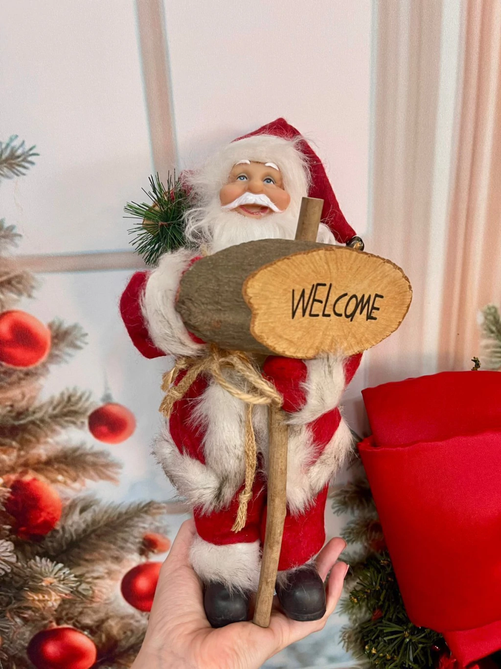 Papai Noel de 30 cm, com roupa vermelha e detalhes rústicos, trazendo um toque acolhedor à decoração. Ele fica em pé e segura uma placa de madeira com a palavra Welcome (bem-vindo), ideal para receber quem chega.