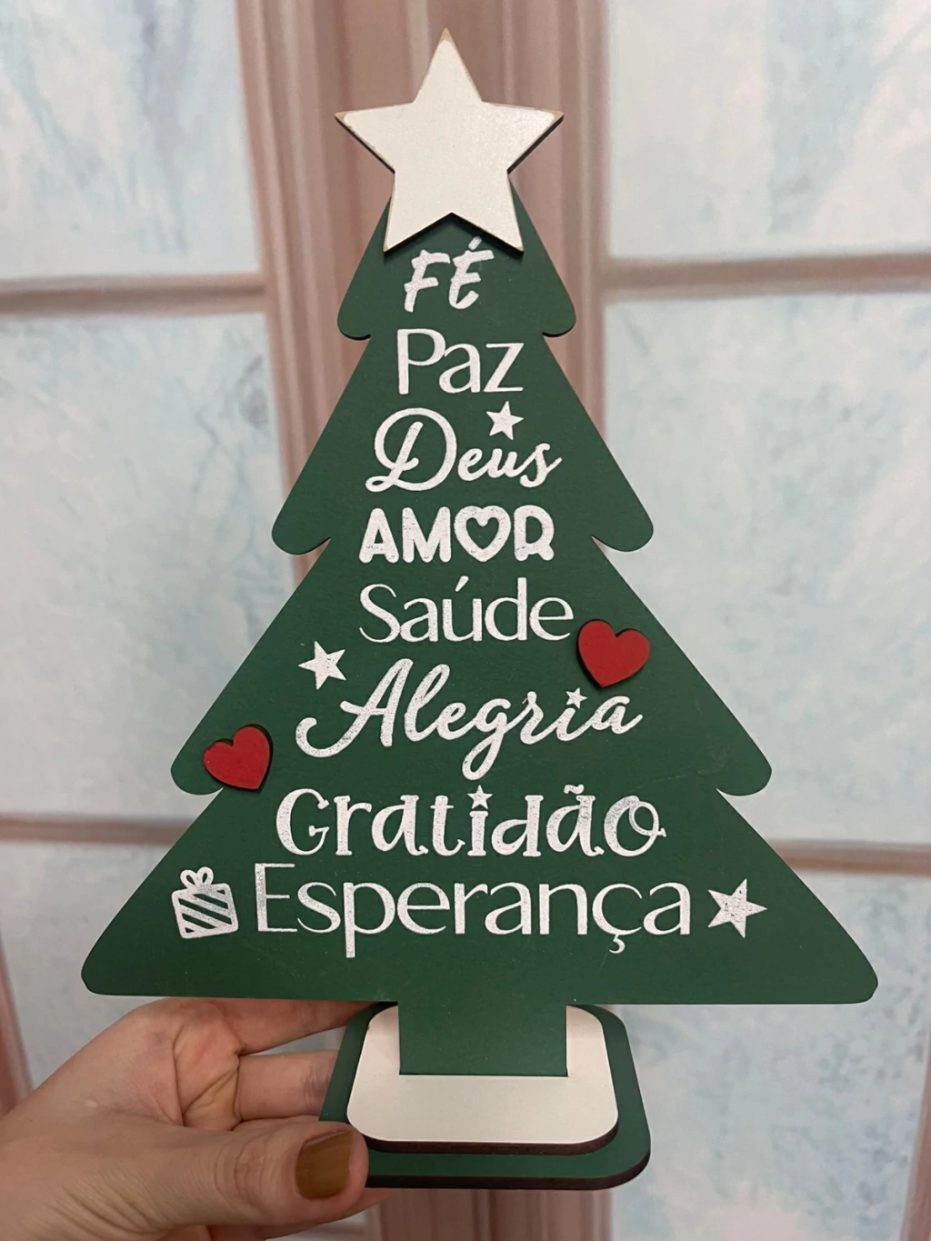 Plaquinha em formato de pinheirinho feita em MDF verde, com palavras que representam o verdadeiro espírito do Natal: fé, paz, Deus, amor, Jesus, família, gratidão e prosperidade. Mede 23 cm de altura por 20 cm de largura e pode ser usada em mesas postas, guirlandas, arranjos ou centros de mesa. Uma peça simbólica que transmite mensagem e beleza na decoração natalina.